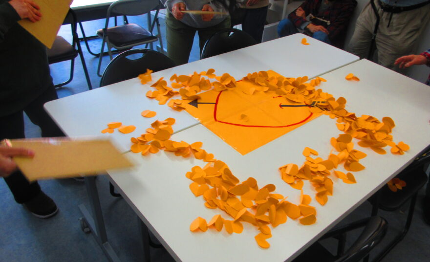 3人づつでうちわを仰いで小さいハートを集めます